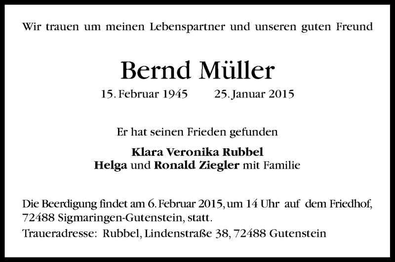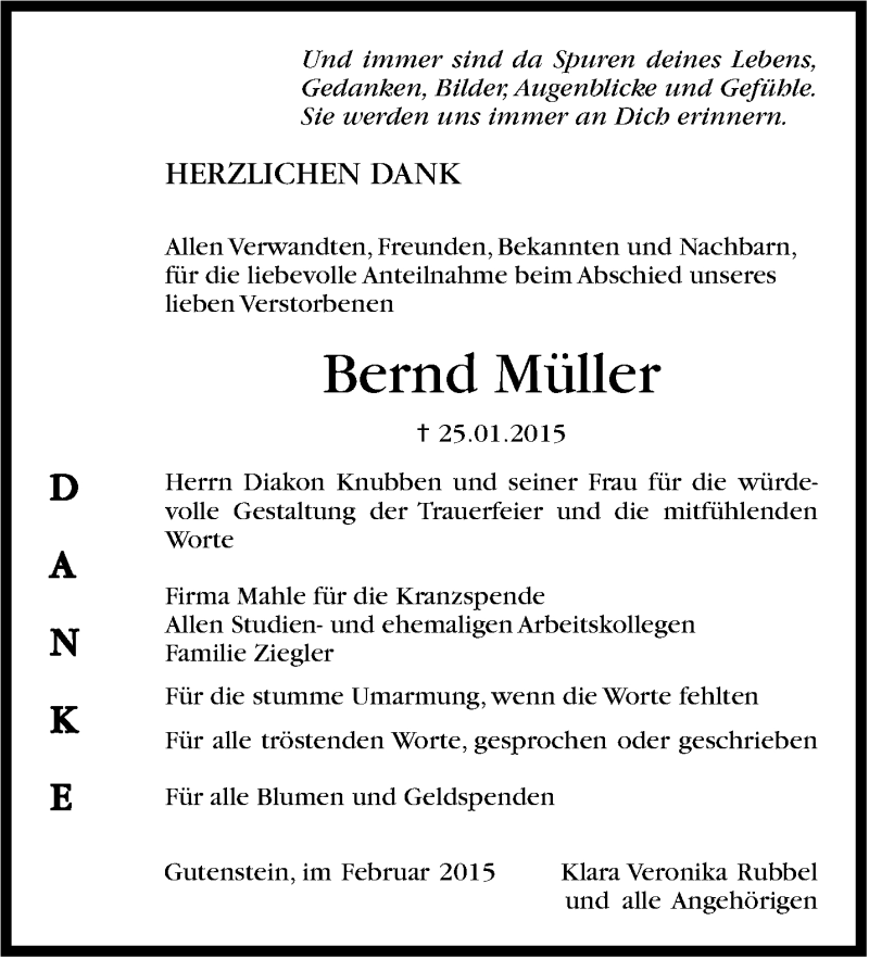 Hier finden Sie alle Traueranzeigen aus der Zeitung, die bisher für Bernd Müller erschienen sind. Weitere Traueranzeigen, die in der Zeitung erscheinen, werden hier ebenfalls aufgelistet