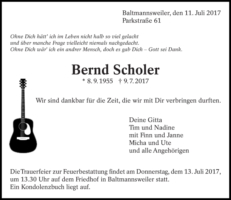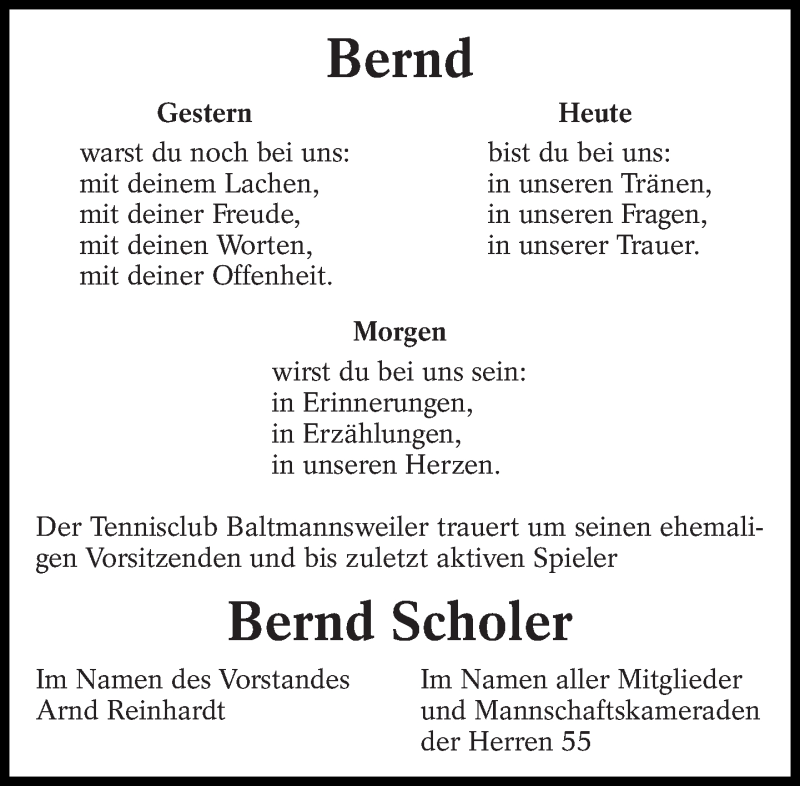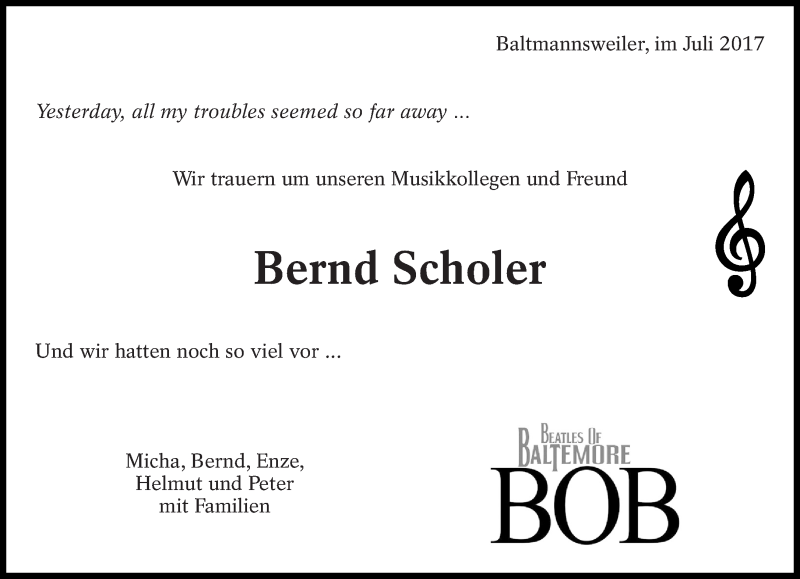 Hier finden Sie alle Traueranzeigen aus der Zeitung, die bisher für Bernd Scholer erschienen sind. Weitere Traueranzeigen, die in der Zeitung erscheinen, werden hier ebenfalls aufgelistet