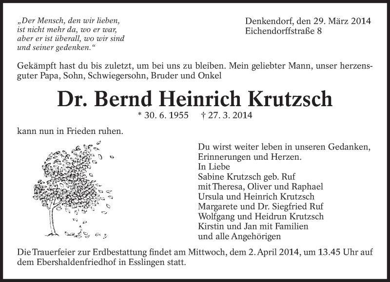 Hier finden Sie alle Traueranzeigen aus der Zeitung, die bisher für Bernd Heinrich Krutzsch erschienen sind. Weitere Traueranzeigen, die in der Zeitung erscheinen, werden hier ebenfalls aufgelistet