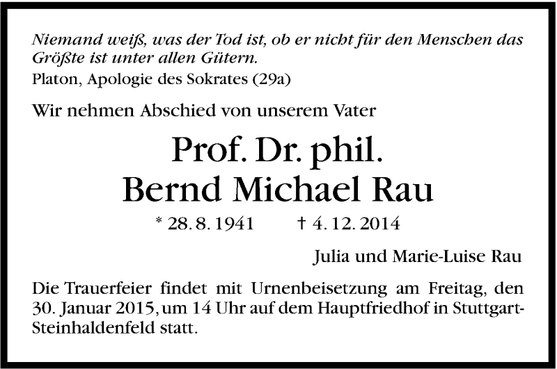 Hier finden Sie alle Traueranzeigen aus der Zeitung, die bisher für Bernd Michael Rau erschienen sind. Weitere Traueranzeigen, die in der Zeitung erscheinen, werden hier ebenfalls aufgelistet