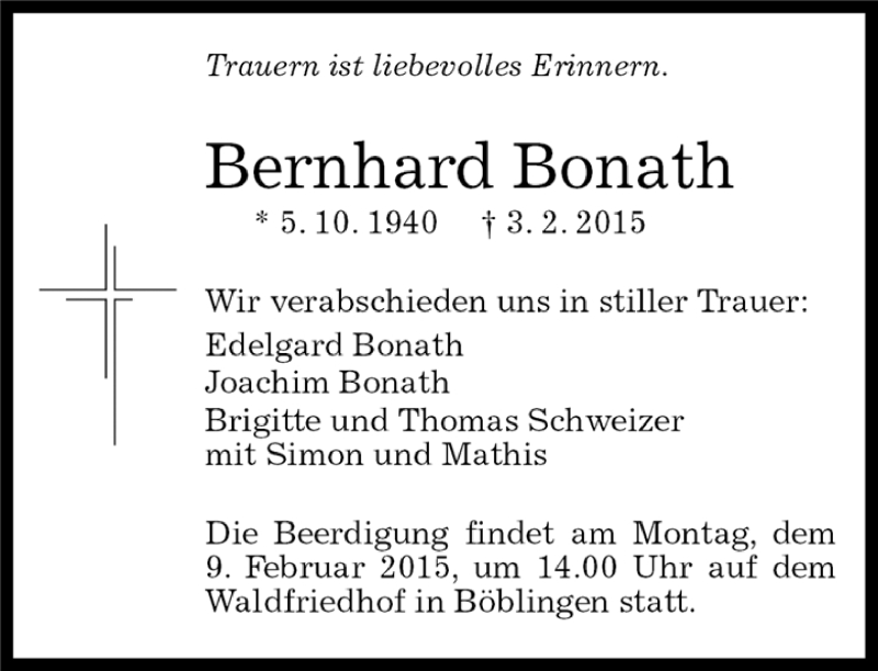 Hier finden Sie alle Traueranzeigen aus der Zeitung, die bisher für Bernhard Bonath erschienen sind. Weitere Traueranzeigen, die in der Zeitung erscheinen, werden hier ebenfalls aufgelistet