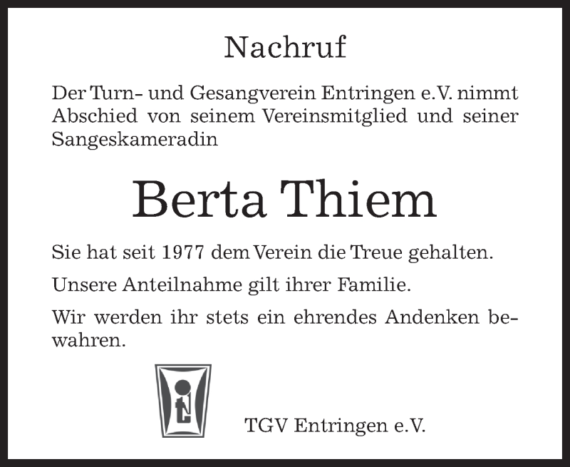 Hier finden Sie alle Traueranzeigen aus der Zeitung, die bisher für Berta Thiem erschienen sind. Weitere Traueranzeigen, die in der Zeitung erscheinen, werden hier ebenfalls aufgelistet