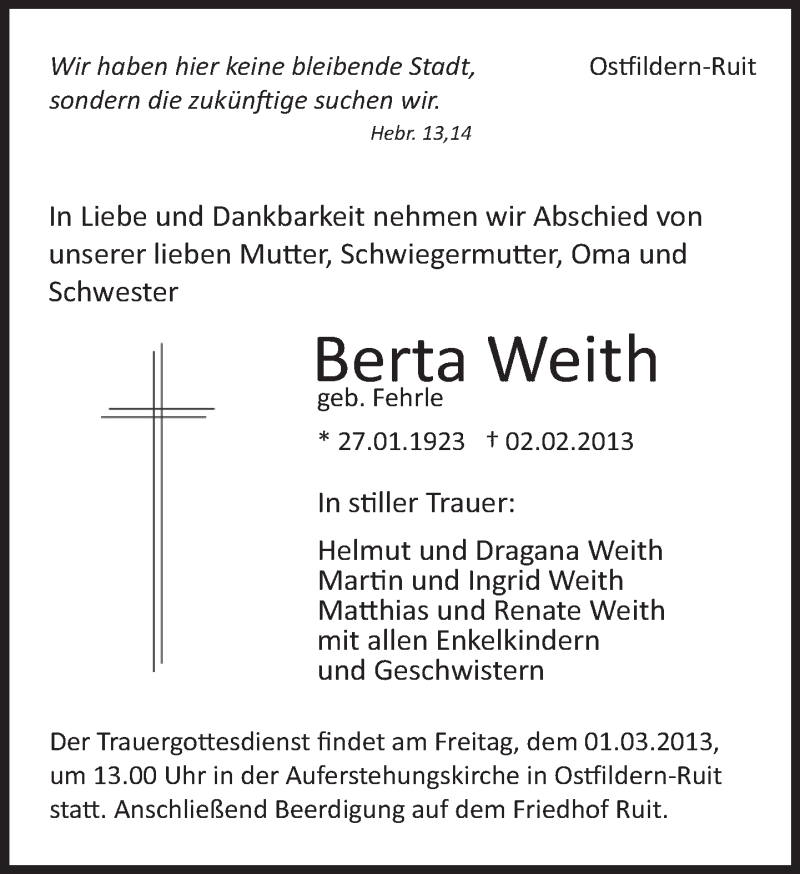 Hier finden Sie alle Traueranzeigen aus der Zeitung, die bisher für Berta Weith erschienen sind. Weitere Traueranzeigen, die in der Zeitung erscheinen, werden hier ebenfalls aufgelistet