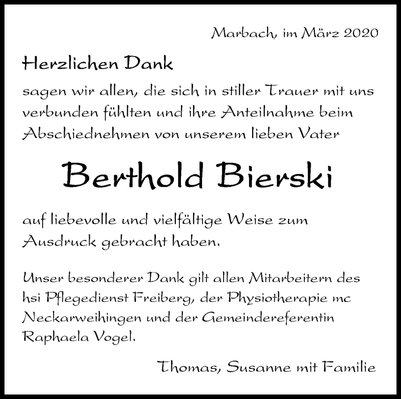 Hier finden Sie alle Traueranzeigen aus der Zeitung, die bisher für Berthold Bierski erschienen sind. Weitere Traueranzeigen, die in der Zeitung erscheinen, werden hier ebenfalls aufgelistet