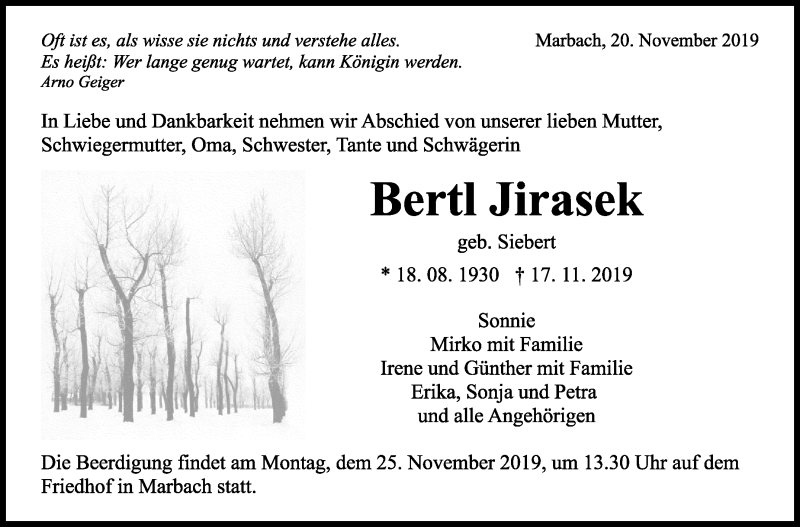 Hier finden Sie alle Traueranzeigen aus der Zeitung, die bisher für Bertl Jirasek erschienen sind. Weitere Traueranzeigen, die in der Zeitung erscheinen, werden hier ebenfalls aufgelistet