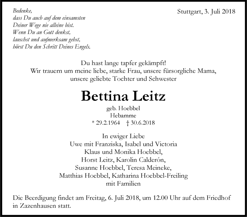 Hier finden Sie alle Traueranzeigen aus der Zeitung, die bisher für Bettina Leitz erschienen sind. Weitere Traueranzeigen, die in der Zeitung erscheinen, werden hier ebenfalls aufgelistet