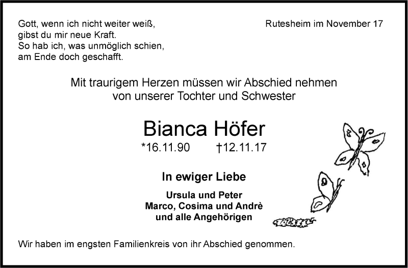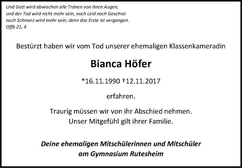 Hier finden Sie alle Traueranzeigen aus der Zeitung, die bisher für Bianca Höfer erschienen sind. Weitere Traueranzeigen, die in der Zeitung erscheinen, werden hier ebenfalls aufgelistet