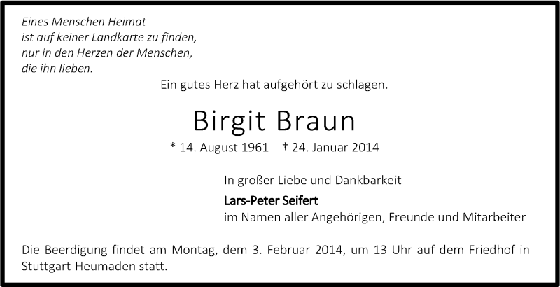 Hier finden Sie alle Traueranzeigen aus der Zeitung, die bisher für Birgit Braun erschienen sind. Weitere Traueranzeigen, die in der Zeitung erscheinen, werden hier ebenfalls aufgelistet