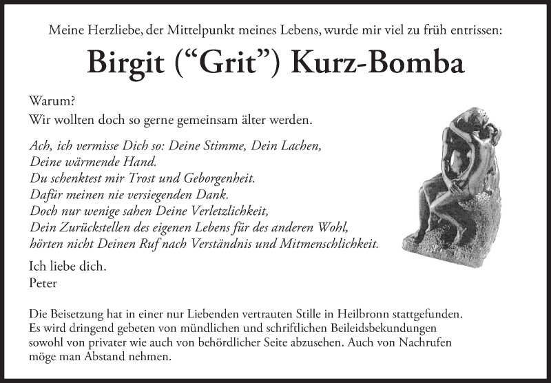Hier finden Sie alle Traueranzeigen aus der Zeitung, die bisher für Birgit Kurz-Bomba erschienen sind. Weitere Traueranzeigen, die in der Zeitung erscheinen, werden hier ebenfalls aufgelistet