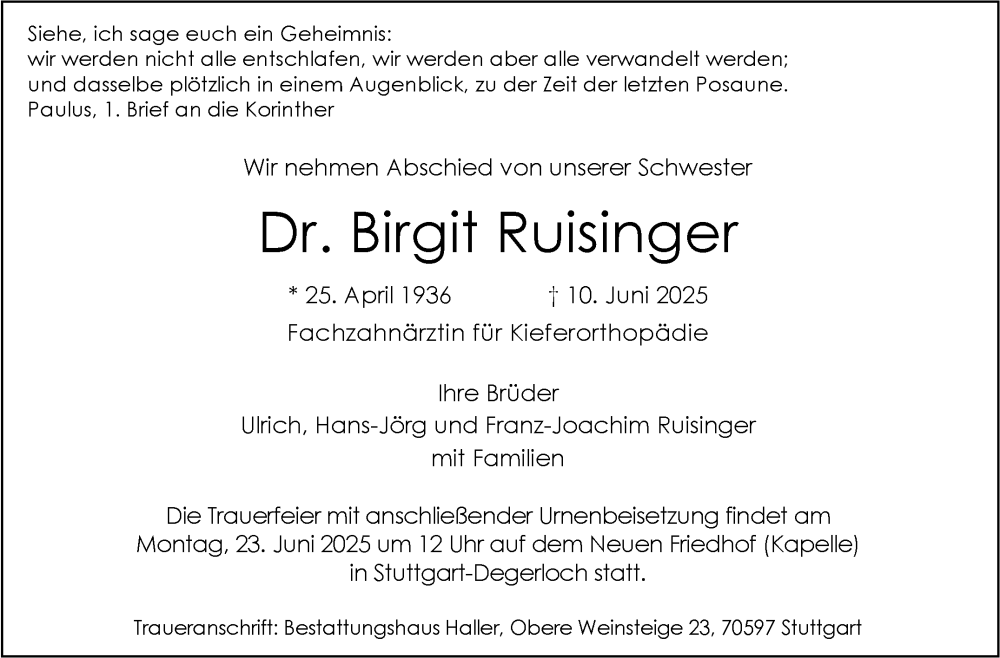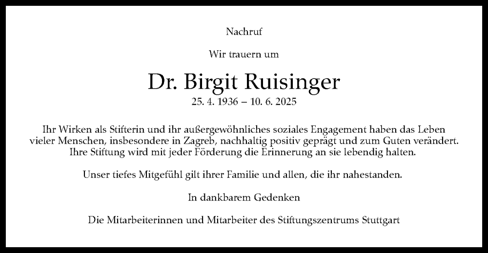 Hier finden Sie alle Traueranzeigen aus der Zeitung, die bisher für Birgit Ruisinger erschienen sind. Weitere Traueranzeigen, die in der Zeitung erscheinen, werden hier ebenfalls aufgelistet