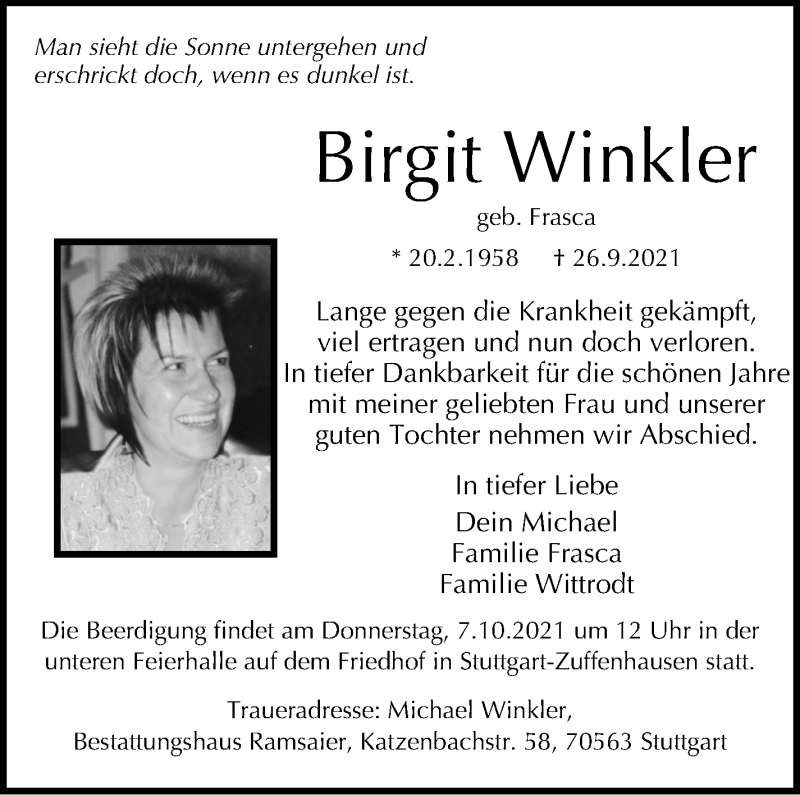 Hier finden Sie alle Traueranzeigen aus der Zeitung, die bisher für Birgit Winkler erschienen sind. Weitere Traueranzeigen, die in der Zeitung erscheinen, werden hier ebenfalls aufgelistet