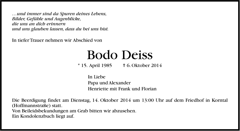 Hier finden Sie alle Traueranzeigen aus der Zeitung, die bisher für Bodo Deiss erschienen sind. Weitere Traueranzeigen, die in der Zeitung erscheinen, werden hier ebenfalls aufgelistet