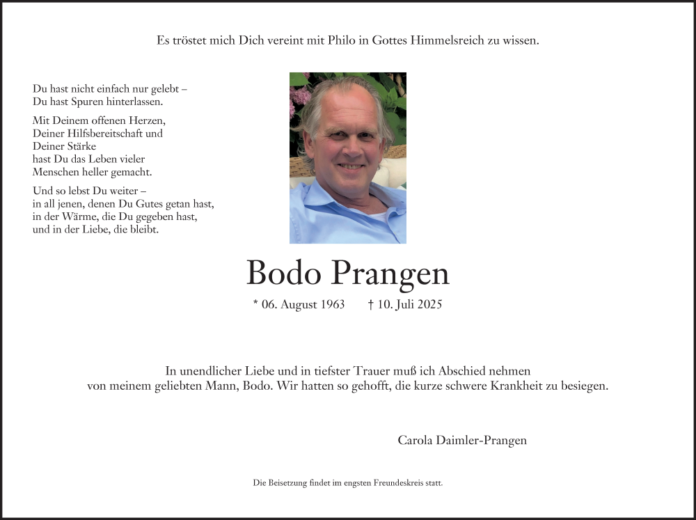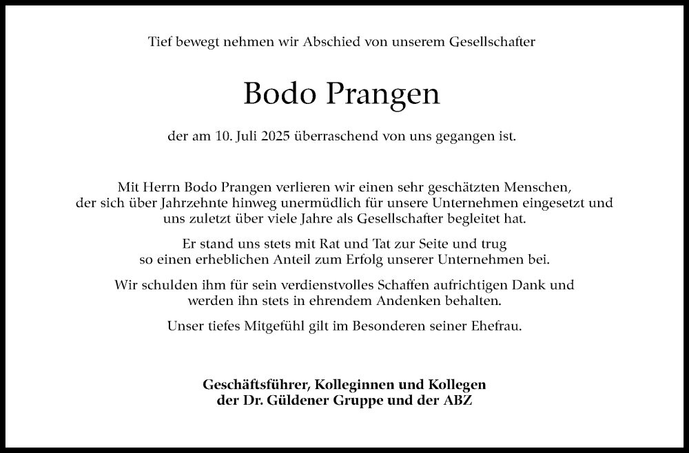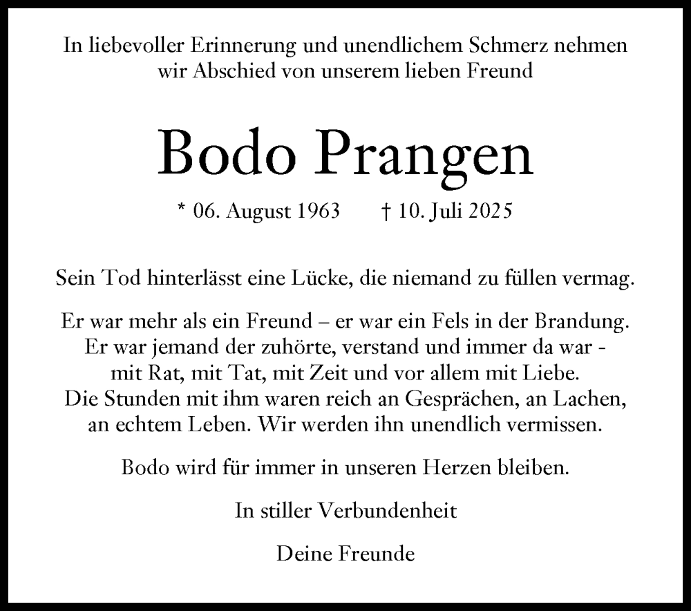 Hier finden Sie alle Traueranzeigen aus der Zeitung, die bisher für Bodo Prangen erschienen sind. Weitere Traueranzeigen, die in der Zeitung erscheinen, werden hier ebenfalls aufgelistet