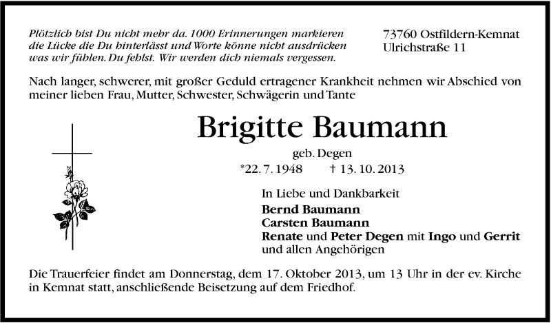Hier finden Sie alle Traueranzeigen aus der Zeitung, die bisher für Brigitte Baumann erschienen sind. Weitere Traueranzeigen, die in der Zeitung erscheinen, werden hier ebenfalls aufgelistet