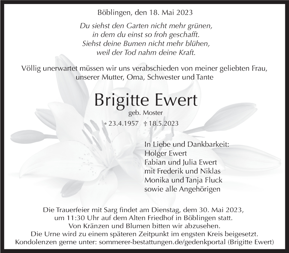 Hier finden Sie alle Traueranzeigen aus der Zeitung, die bisher für Brigitte Ewert erschienen sind. Weitere Traueranzeigen, die in der Zeitung erscheinen, werden hier ebenfalls aufgelistet