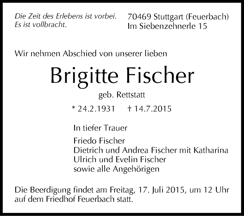 Hier finden Sie alle Traueranzeigen aus der Zeitung, die bisher für Brigitte Fischer erschienen sind. Weitere Traueranzeigen, die in der Zeitung erscheinen, werden hier ebenfalls aufgelistet