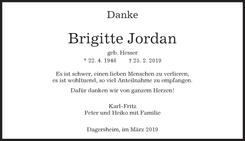 Hier finden Sie alle Traueranzeigen aus der Zeitung, die bisher für Brigitte Jordan erschienen sind. Weitere Traueranzeigen, die in der Zeitung erscheinen, werden hier ebenfalls aufgelistet