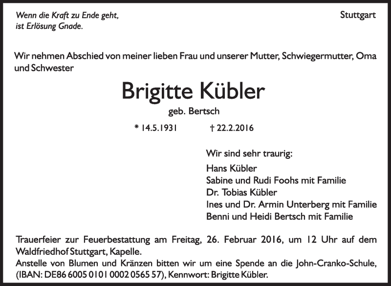 Hier finden Sie alle Traueranzeigen aus der Zeitung, die bisher für Brigitte Kübler erschienen sind. Weitere Traueranzeigen, die in der Zeitung erscheinen, werden hier ebenfalls aufgelistet