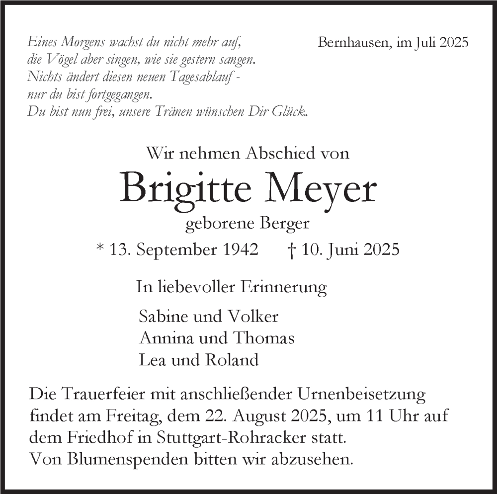 Hier finden Sie alle Traueranzeigen aus der Zeitung, die bisher für Brigitte Meyer erschienen sind. Weitere Traueranzeigen, die in der Zeitung erscheinen, werden hier ebenfalls aufgelistet