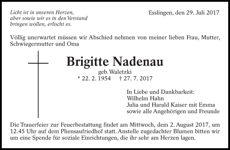 Hier finden Sie alle Traueranzeigen aus der Zeitung, die bisher für Brigitte Nadenau erschienen sind. Weitere Traueranzeigen, die in der Zeitung erscheinen, werden hier ebenfalls aufgelistet