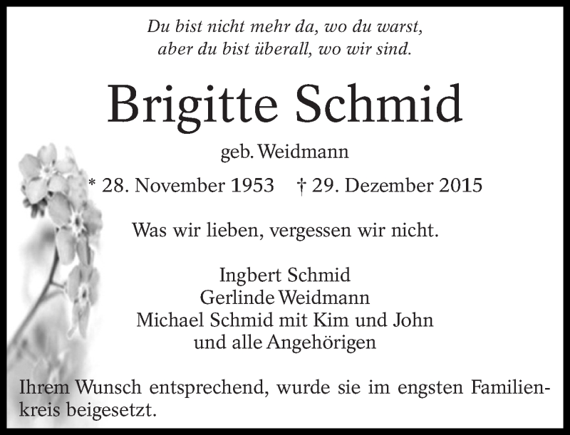 Hier finden Sie alle Traueranzeigen aus der Zeitung, die bisher für Brigitte Schmid erschienen sind. Weitere Traueranzeigen, die in der Zeitung erscheinen, werden hier ebenfalls aufgelistet