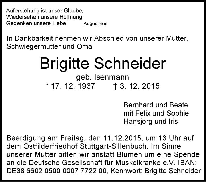 Hier finden Sie alle Traueranzeigen aus der Zeitung, die bisher für Brigitte Schneider erschienen sind. Weitere Traueranzeigen, die in der Zeitung erscheinen, werden hier ebenfalls aufgelistet