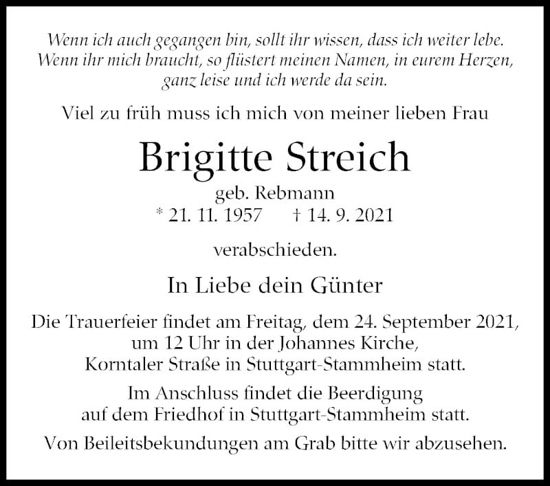 Hier finden Sie alle Traueranzeigen aus der Zeitung, die bisher für Brigitte Streich erschienen sind. Weitere Traueranzeigen, die in der Zeitung erscheinen, werden hier ebenfalls aufgelistet
