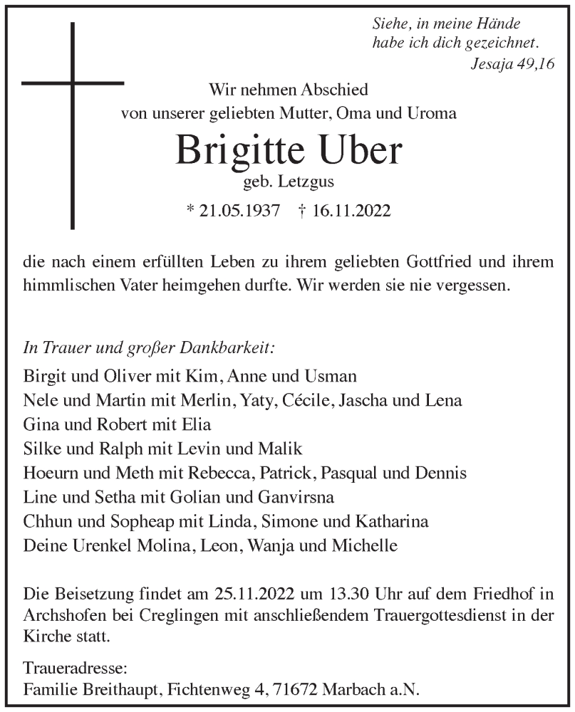 Hier finden Sie alle Traueranzeigen aus der Zeitung, die bisher für Brigitte Uber erschienen sind. Weitere Traueranzeigen, die in der Zeitung erscheinen, werden hier ebenfalls aufgelistet