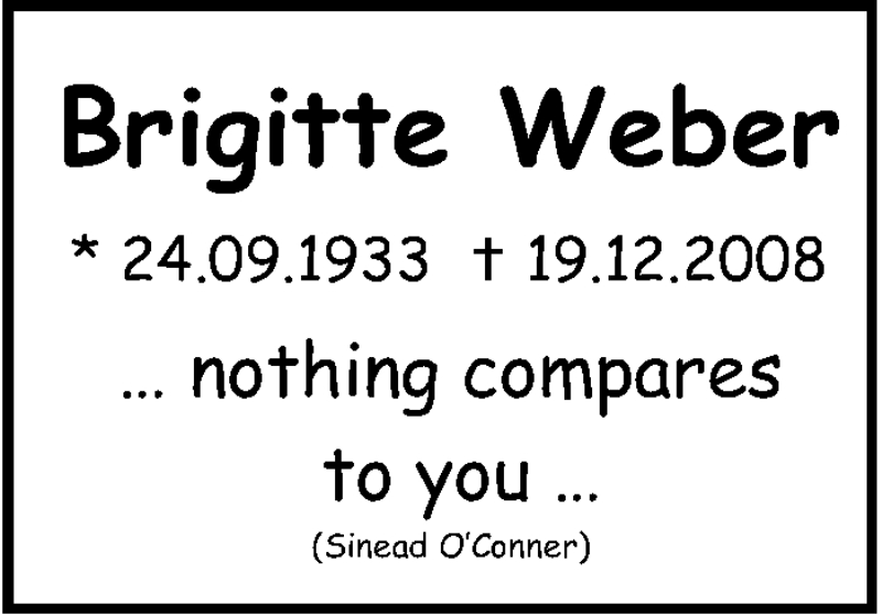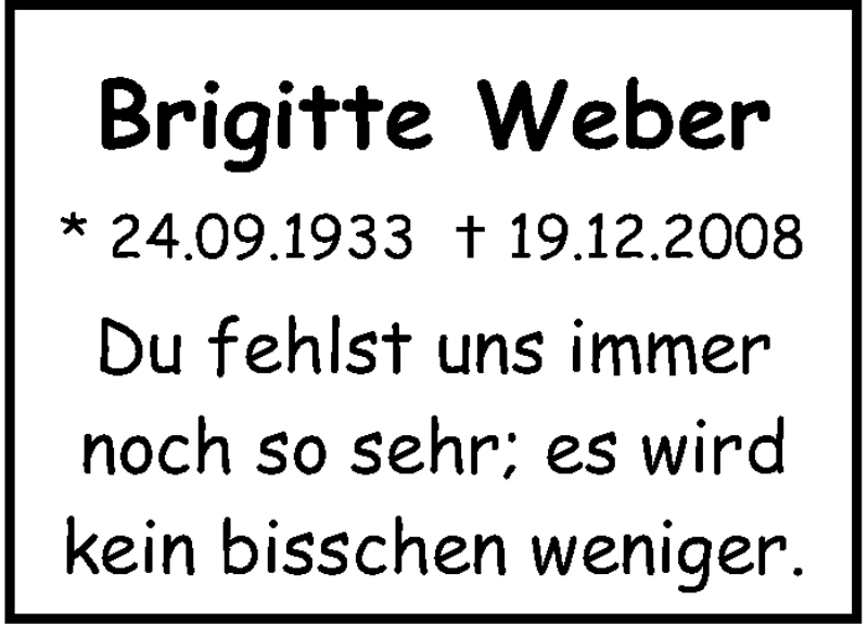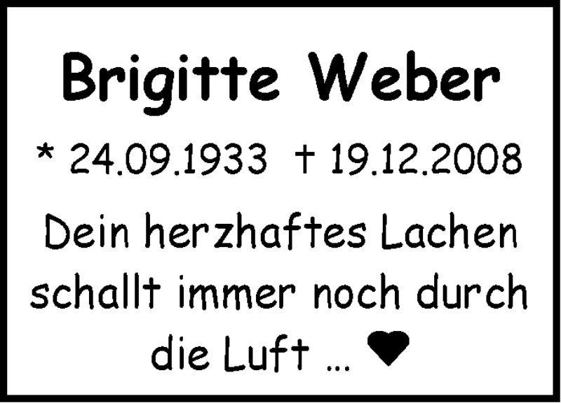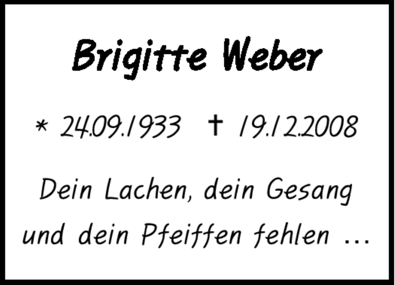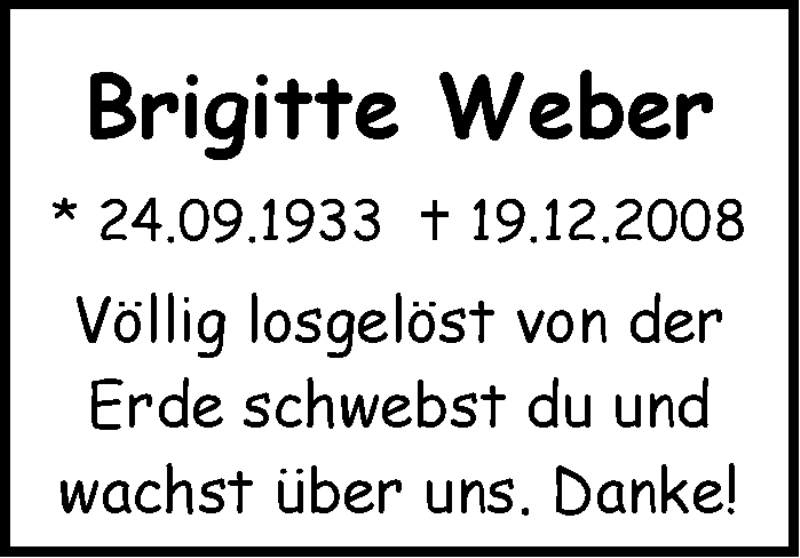 Hier finden Sie alle Traueranzeigen aus der Zeitung, die bisher für Brigitte Weber erschienen sind. Weitere Traueranzeigen, die in der Zeitung erscheinen, werden hier ebenfalls aufgelistet