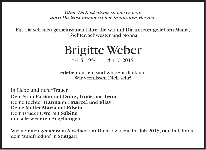 Hier finden Sie alle Traueranzeigen aus der Zeitung, die bisher für Brigitte Weber erschienen sind. Weitere Traueranzeigen, die in der Zeitung erscheinen, werden hier ebenfalls aufgelistet