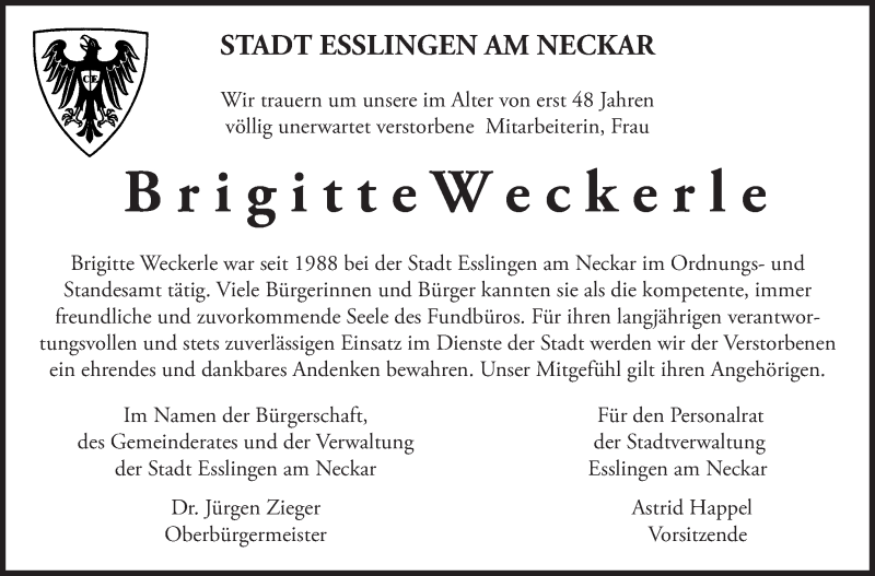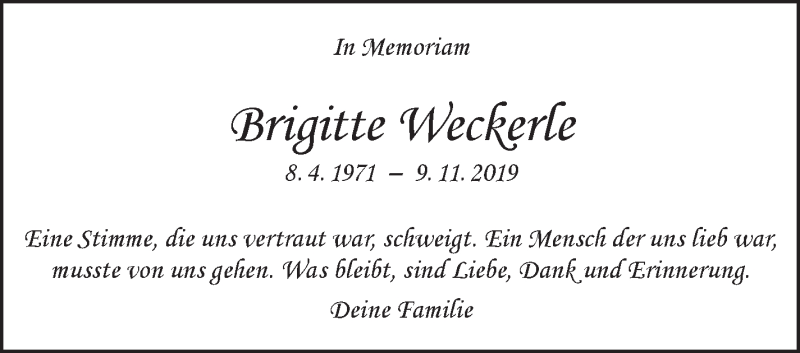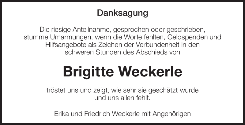 Hier finden Sie alle Traueranzeigen aus der Zeitung, die bisher für Brigitte Weckerle erschienen sind. Weitere Traueranzeigen, die in der Zeitung erscheinen, werden hier ebenfalls aufgelistet