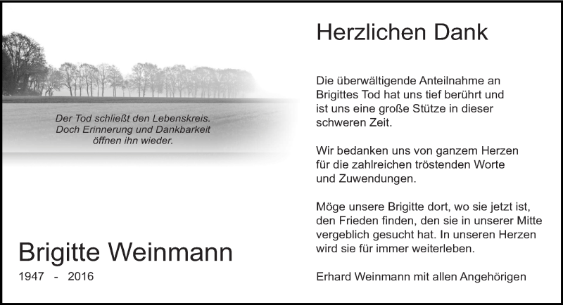 Hier finden Sie alle Traueranzeigen aus der Zeitung, die bisher für Brigitte Weinmann erschienen sind. Weitere Traueranzeigen, die in der Zeitung erscheinen, werden hier ebenfalls aufgelistet
