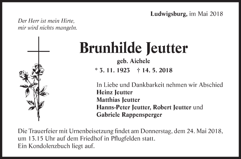 Hier finden Sie alle Traueranzeigen aus der Zeitung, die bisher für Brunhilde Jeutter erschienen sind. Weitere Traueranzeigen, die in der Zeitung erscheinen, werden hier ebenfalls aufgelistet