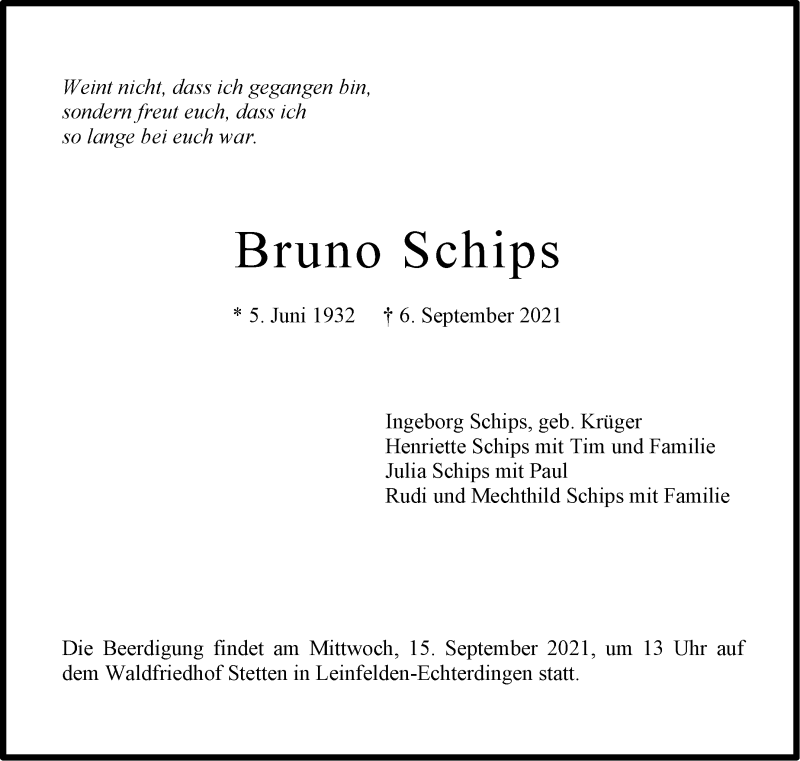 Hier finden Sie alle Traueranzeigen aus der Zeitung, die bisher für Bruno Schips erschienen sind. Weitere Traueranzeigen, die in der Zeitung erscheinen, werden hier ebenfalls aufgelistet