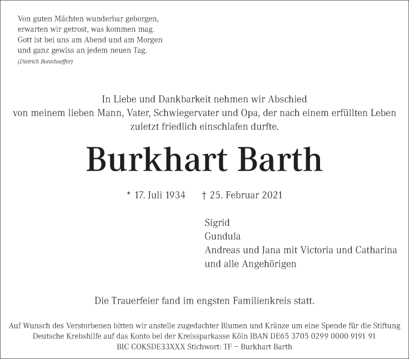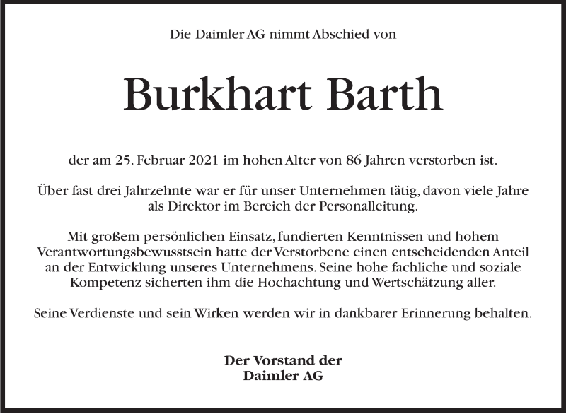 Hier finden Sie alle Traueranzeigen aus der Zeitung, die bisher für Burkhart Barth erschienen sind. Weitere Traueranzeigen, die in der Zeitung erscheinen, werden hier ebenfalls aufgelistet