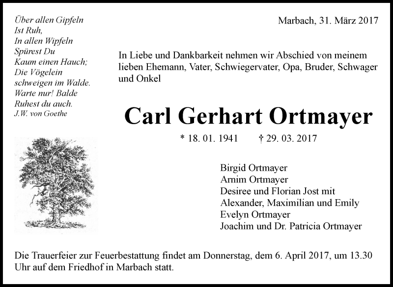 Hier finden Sie alle Traueranzeigen aus der Zeitung, die bisher für Carl Gerhart Ortmayer erschienen sind. Weitere Traueranzeigen, die in der Zeitung erscheinen, werden hier ebenfalls aufgelistet