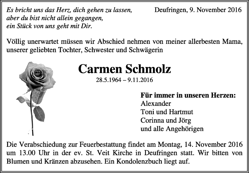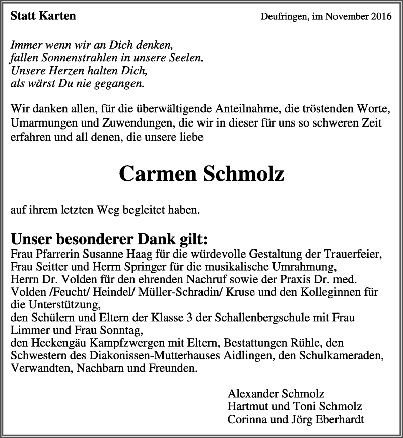 Hier finden Sie alle Traueranzeigen aus der Zeitung, die bisher für Carmen Schmolz erschienen sind. Weitere Traueranzeigen, die in der Zeitung erscheinen, werden hier ebenfalls aufgelistet