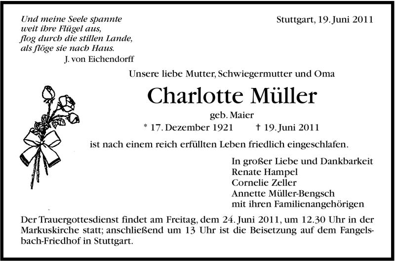 Hier finden Sie alle Traueranzeigen aus der Zeitung, die bisher für Charlotte Müller erschienen sind. Weitere Traueranzeigen, die in der Zeitung erscheinen, werden hier ebenfalls aufgelistet