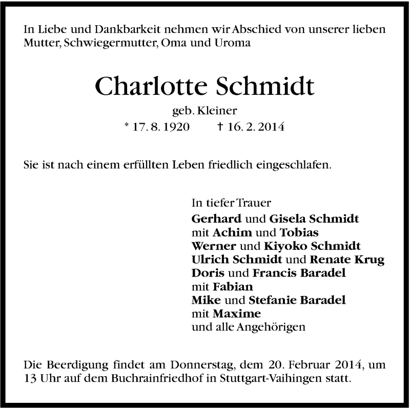 Hier finden Sie alle Traueranzeigen aus der Zeitung, die bisher für Charlotte Schmidt erschienen sind. Weitere Traueranzeigen, die in der Zeitung erscheinen, werden hier ebenfalls aufgelistet