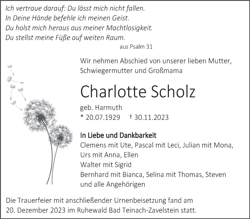 Hier finden Sie alle Traueranzeigen aus der Zeitung, die bisher für Charlotte Scholz erschienen sind. Weitere Traueranzeigen, die in der Zeitung erscheinen, werden hier ebenfalls aufgelistet
