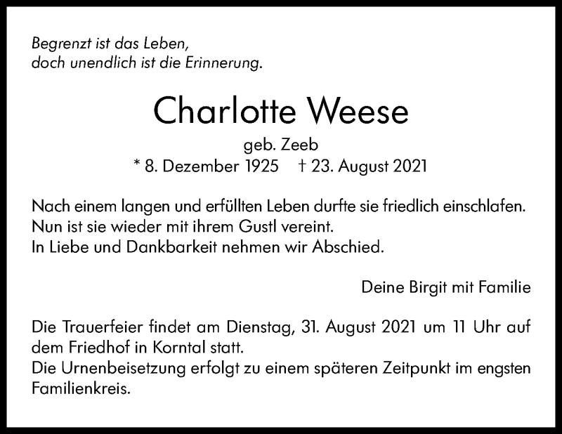 Hier finden Sie alle Traueranzeigen aus der Zeitung, die bisher für Charlotte Weese erschienen sind. Weitere Traueranzeigen, die in der Zeitung erscheinen, werden hier ebenfalls aufgelistet