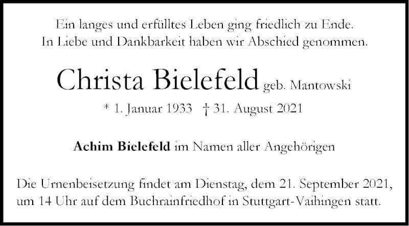 Hier finden Sie alle Traueranzeigen aus der Zeitung, die bisher für Christa Bielefeld erschienen sind. Weitere Traueranzeigen, die in der Zeitung erscheinen, werden hier ebenfalls aufgelistet
