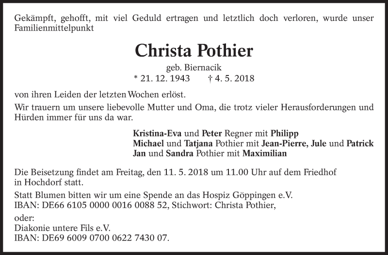 Hier finden Sie alle Traueranzeigen aus der Zeitung, die bisher für Christa Pothier erschienen sind. Weitere Traueranzeigen, die in der Zeitung erscheinen, werden hier ebenfalls aufgelistet
