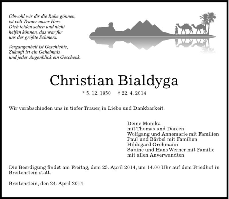 Hier finden Sie alle Traueranzeigen aus der Zeitung, die bisher für Christian Bialdyga erschienen sind. Weitere Traueranzeigen, die in der Zeitung erscheinen, werden hier ebenfalls aufgelistet