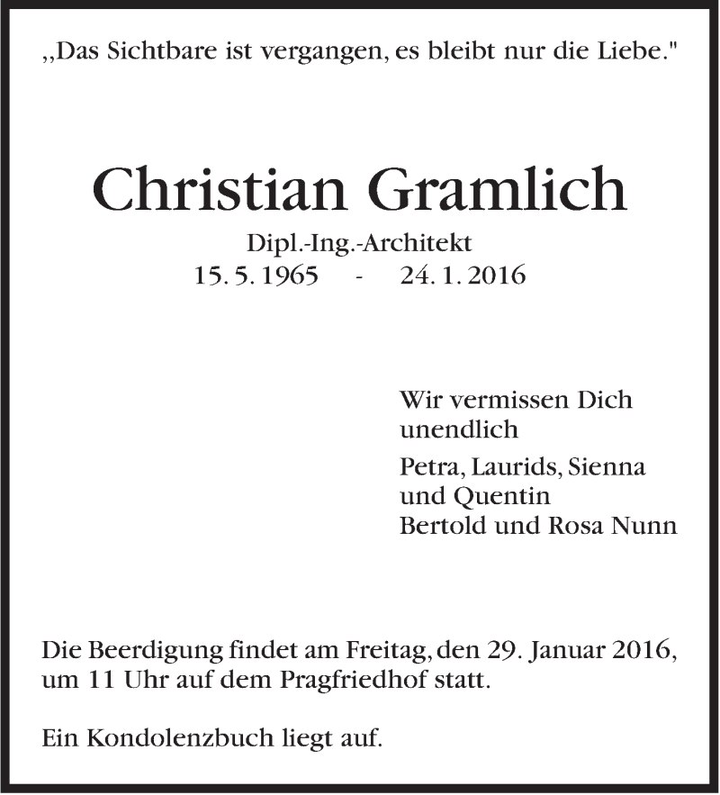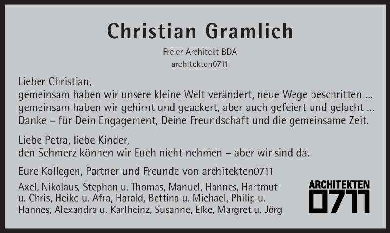 Hier finden Sie alle Traueranzeigen aus der Zeitung, die bisher für Christian Gramlich erschienen sind. Weitere Traueranzeigen, die in der Zeitung erscheinen, werden hier ebenfalls aufgelistet
