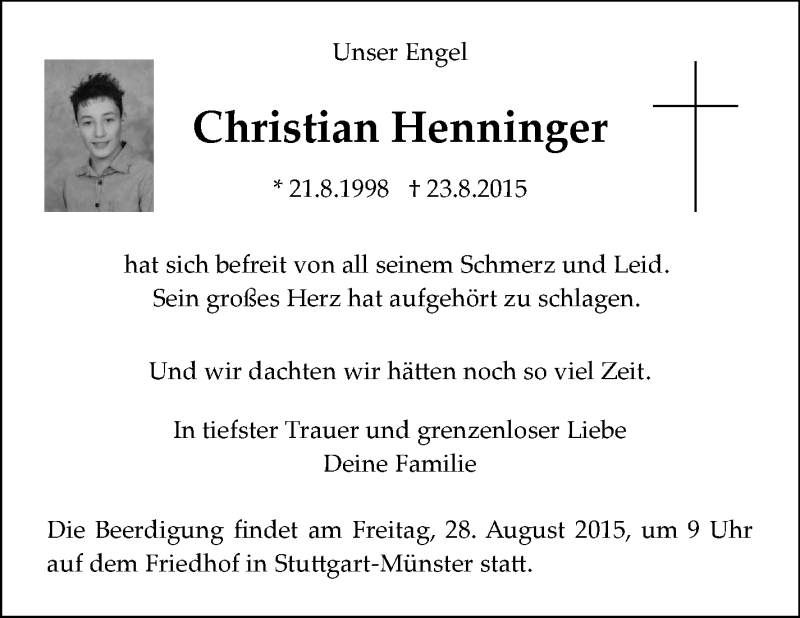 Hier finden Sie alle Traueranzeigen aus der Zeitung, die bisher für Christian Henninger erschienen sind. Weitere Traueranzeigen, die in der Zeitung erscheinen, werden hier ebenfalls aufgelistet