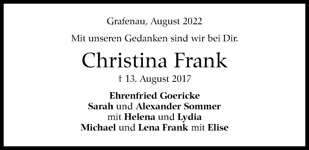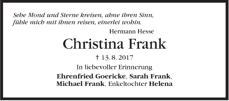 Hier finden Sie alle Traueranzeigen aus der Zeitung, die bisher für Christina Frank erschienen sind. Weitere Traueranzeigen, die in der Zeitung erscheinen, werden hier ebenfalls aufgelistet