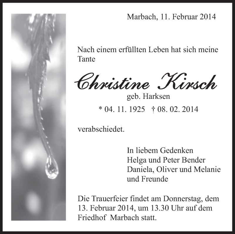 Hier finden Sie alle Traueranzeigen aus der Zeitung, die bisher für Christine Kirsch erschienen sind. Weitere Traueranzeigen, die in der Zeitung erscheinen, werden hier ebenfalls aufgelistet