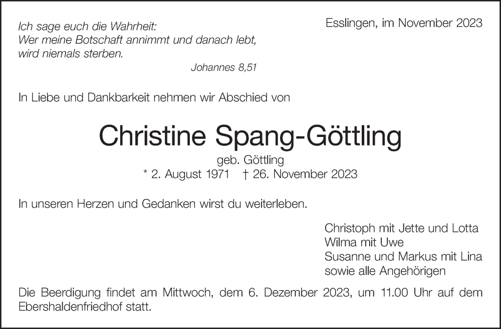 Hier finden Sie alle Traueranzeigen aus der Zeitung, die bisher für Christine Spang-Göttling erschienen sind. Weitere Traueranzeigen, die in der Zeitung erscheinen, werden hier ebenfalls aufgelistet