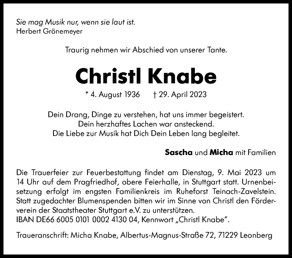 Hier finden Sie alle Traueranzeigen aus der Zeitung, die bisher für Christl Knabe erschienen sind. Weitere Traueranzeigen, die in der Zeitung erscheinen, werden hier ebenfalls aufgelistet